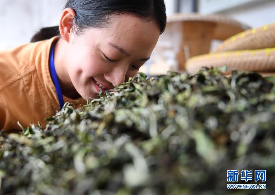 10月9日,參賽選手將茶葉上架曬制。