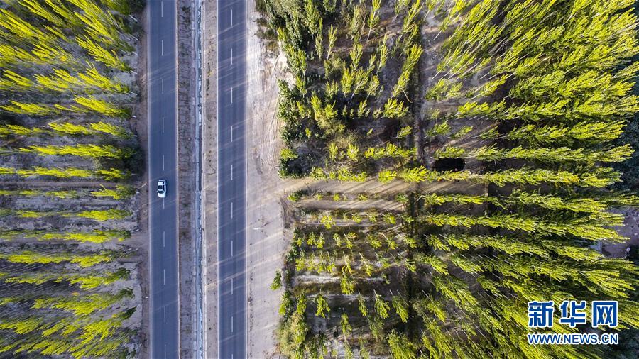 車輛行駛在新疆阿克蘇地區(qū)柯柯牙綠化工程核心區(qū)(9月20日無人機(jī)拍攝)。 在世界第二大流動(dòng)性沙漠——塔克拉瑪干沙漠西北邊,一條逾百萬畝的人工林帶傲然挺立。 這條林帶就是柯柯牙荒漠綠化工程。它是新疆阿克蘇黃沙漫漫和碧波萬頃的分界嶺。 1986年,為改變惡劣的自然條件,阿克蘇啟動(dòng)柯柯牙綠化工程。30年間,各族干部群眾攜手奮斗,曾是沙塵暴策源地的柯柯牙綠樹成蔭;并以此為原點(diǎn),在南疆戈壁荒灘上孕育出百萬畝的“綠?!?。 30多年來,阿克蘇打造出“人走政不息”的樣本,使綠色發(fā)展理念成為幾代人的廣泛共識(shí);“自力更生、艱苦奮斗、無私奉獻(xiàn)”的柯柯牙精神,已融入各族兒女血液中;“以林養(yǎng)林”“邊綠化邊脫貧”的綠化、脫貧方式,給其他荒漠地區(qū)貢獻(xiàn)了“柯柯牙智慧”。 新華社記者 胡虎虎 攝