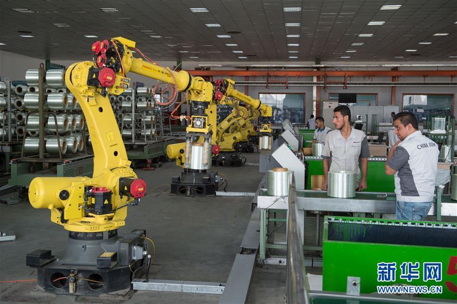 2018年8月28日,在埃及蘇伊士運(yùn)河之畔的泰達(dá)工業(yè)園區(qū),埃及工人在中國巨石埃及玻璃纖維股份有限公司(巨石埃及)生產(chǎn)車間內(nèi)工作。
