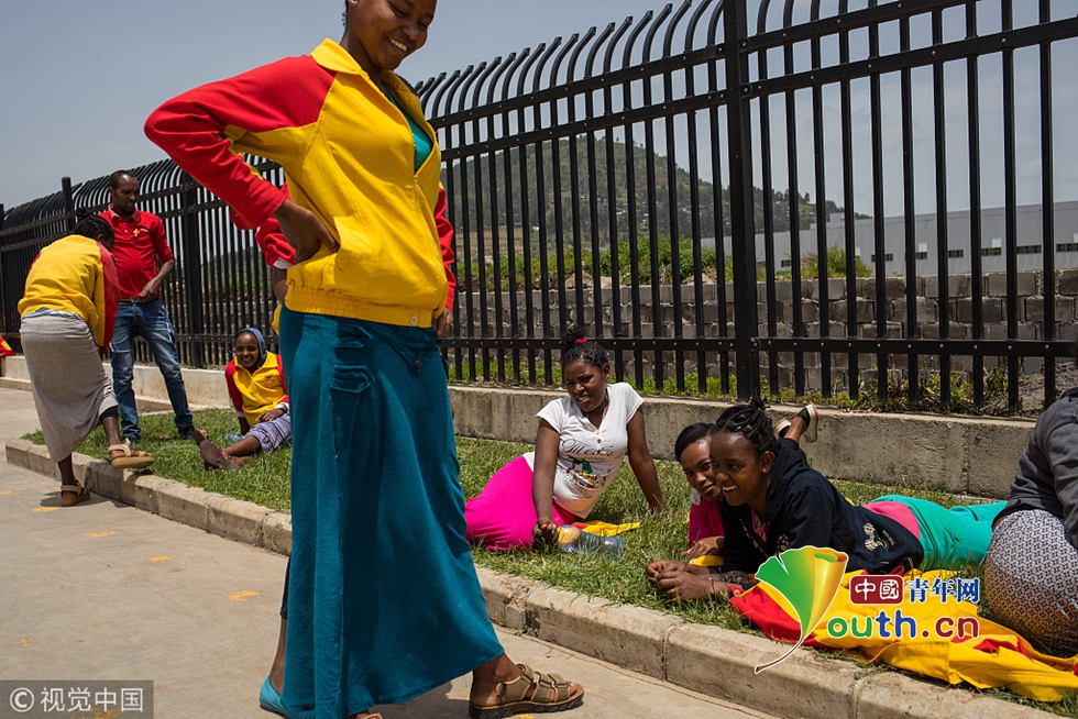 7月31日,埃塞俄比亞首都亞的斯亞貝巴的一家中國(guó)民營(yíng)制鞋工廠——華堅(jiān)鞋廠,下午的工作開始前,當(dāng)?shù)毓蛦T用中文喊著“一二三四”列隊(duì)集合,合唱廠歌。