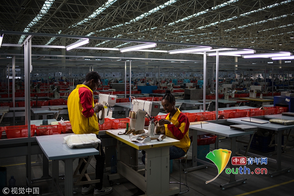 當(dāng)?shù)貢r(shí)間2018年8月1日,埃塞俄比亞。埃塞俄比亞首都亞的斯亞貝巴南部郊外,有一座東方工業(yè)園,這是中國(guó)在埃塞俄比亞的首個(gè)國(guó)家級(jí)境外經(jīng)貿(mào)合作區(qū)。園區(qū)占地5平方公里,連接著兩個(gè)60萬(wàn)人口的城鎮(zhèn),目前已經(jīng)有85家企業(yè)入駐,行業(yè)涉及紡織、服裝、制鞋、鋼筋、水泥、制藥、汽車組裝等,這些企業(yè)絕大部分來(lái)自中國(guó)。圖為鞋廠工人在2015年啟用的新廠區(qū)內(nèi)工作。