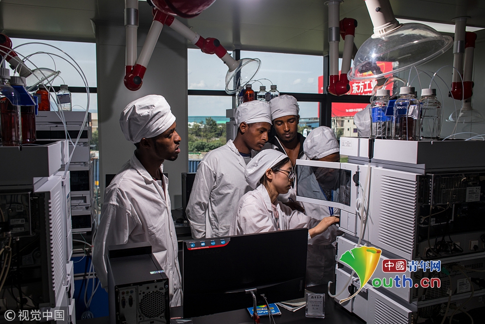 7月30日,埃塞俄比亞,首都亞的斯亞貝巴的東方工業(yè)園內(nèi)一家中國(guó)制藥廠,27歲的中國(guó)員工汪紅梅為當(dāng)?shù)毓蛦T講解液相色譜器械使用要領(lǐng)。整個(gè)實(shí)驗(yàn)室共有4名中方員工和18名當(dāng)?shù)毓蛦T。