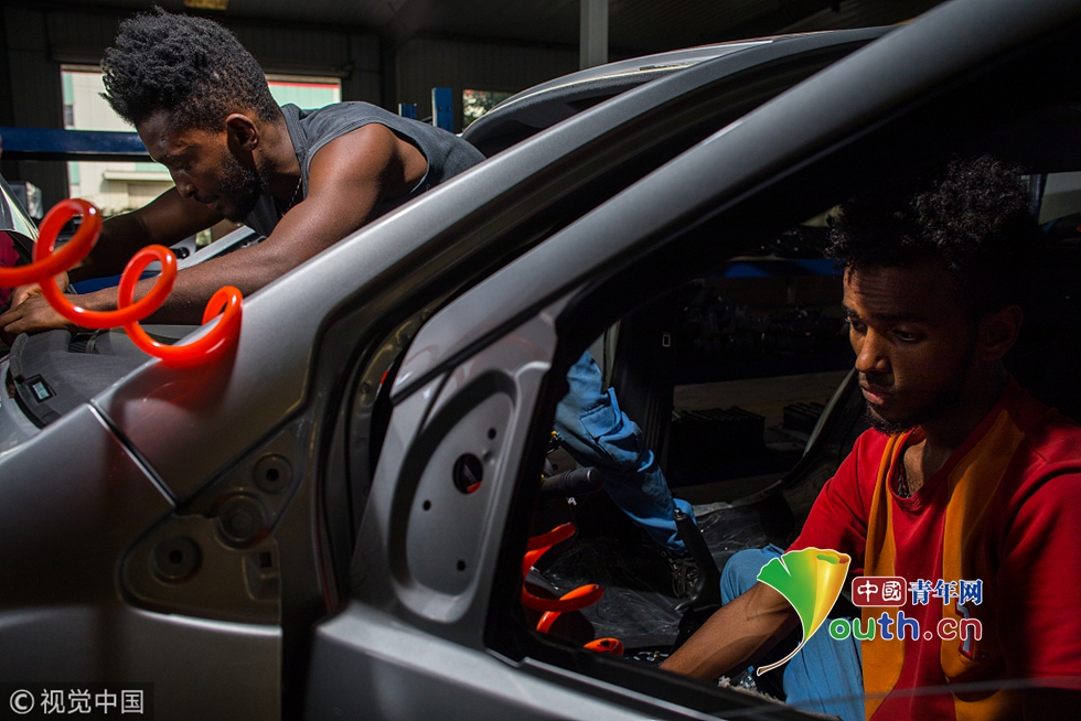 東方工業(yè)園內(nèi)一家汽車組裝廠,18歲的貝亞姆(右)在生產(chǎn)線上工作。