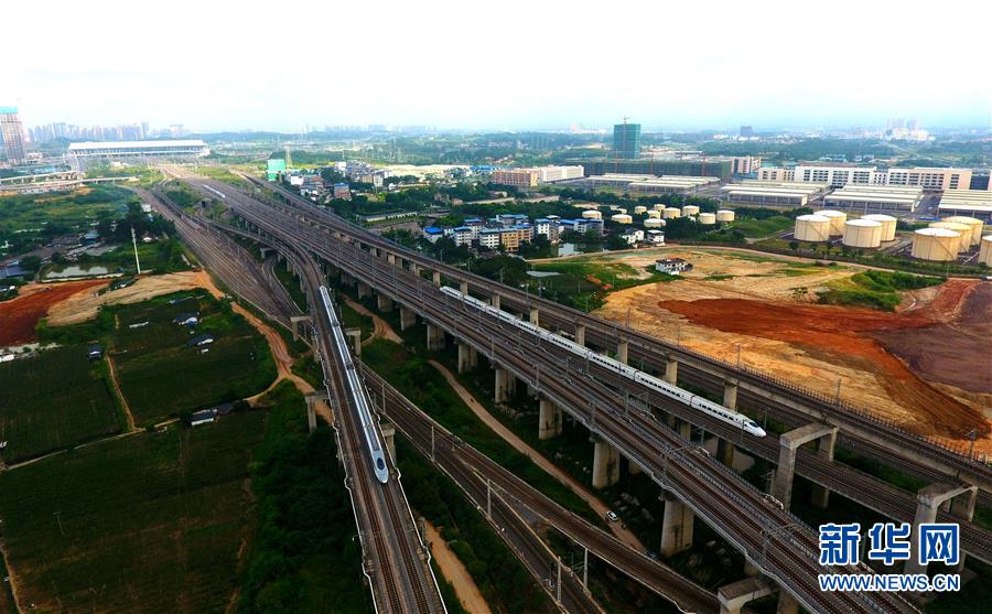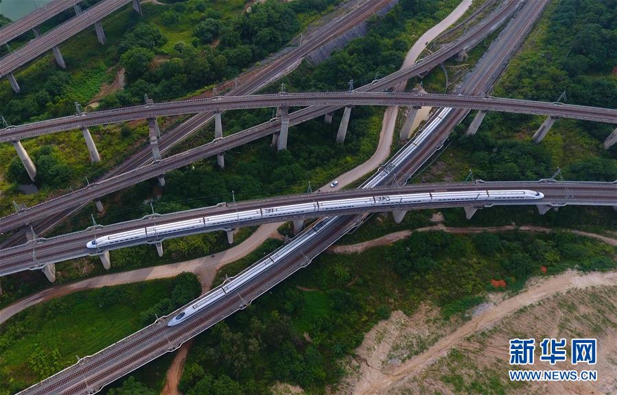 一列動車在南寧市區(qū)行駛(9月4日無人機拍攝)。 廣西壯族自治區(qū)成立60年來,鐵路建設發(fā)生翻天覆地的變化。來自中國鐵路南寧局集團有限公司的數(shù)據(jù)顯示,1958年廣西鐵路總里程為1346.3公里,如今廣西鐵路總里程達5191公里。廣西與周邊相鄰省份間實現(xiàn)動車“公交化”開行。此外,北部灣港—重慶班列、東盟海產(chǎn)品冷鏈班列、“百色一號”果蔬專列等的開通和運營,強化了鐵路供給的針對性和有效性。鐵路成為助推廣西經(jīng)濟社會快速發(fā)展的“大動脈”。 新華社記者陸波岸攝