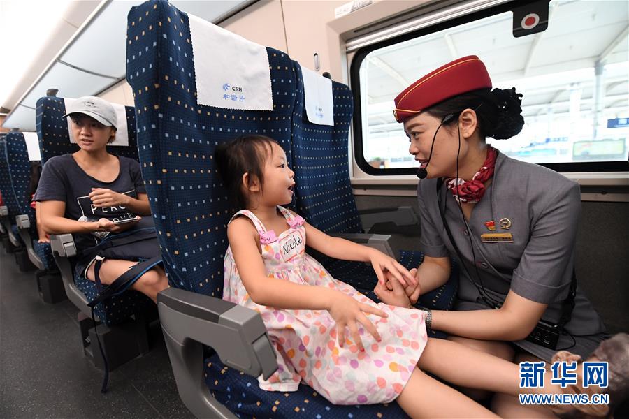 在南寧東站,一名列車工作人員在和一名小朋友交流(2017年8月5日攝)。 廣西壯族自治區(qū)成立60年來,鐵路建設發(fā)生翻天覆地的變化。來自中國鐵路南寧局集團有限公司的數(shù)據(jù)顯示,1958年廣西鐵路總里程為1346.3公里,如今廣西鐵路總里程達5191公里。廣西與周邊相鄰省份間實現(xiàn)動車“公交化”開行。此外,北部灣港—重慶班列、東盟海產(chǎn)品冷鏈班列、“百色一號”果蔬專列等的開通和運營,強化了鐵路供給的針對性和有效性。鐵路成為助推廣西經(jīng)濟社會快速發(fā)展的“大動脈”。 新華社記者陸波岸攝