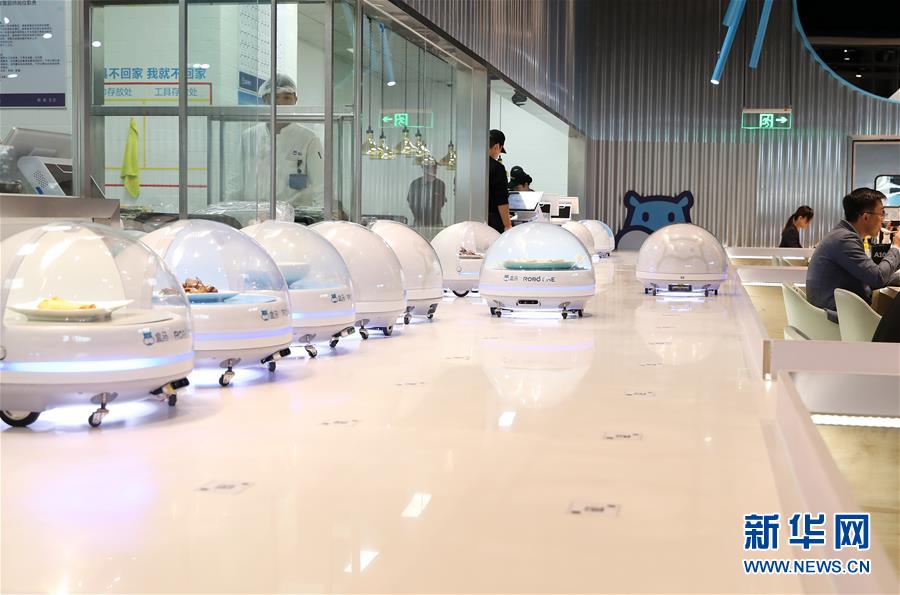 近日,一家由機(jī)器人充當(dāng)送餐服務(wù)員的盒馬機(jī)器人餐廳現(xiàn)身上海國家會展中心,為顧客帶來一種用餐新選擇。