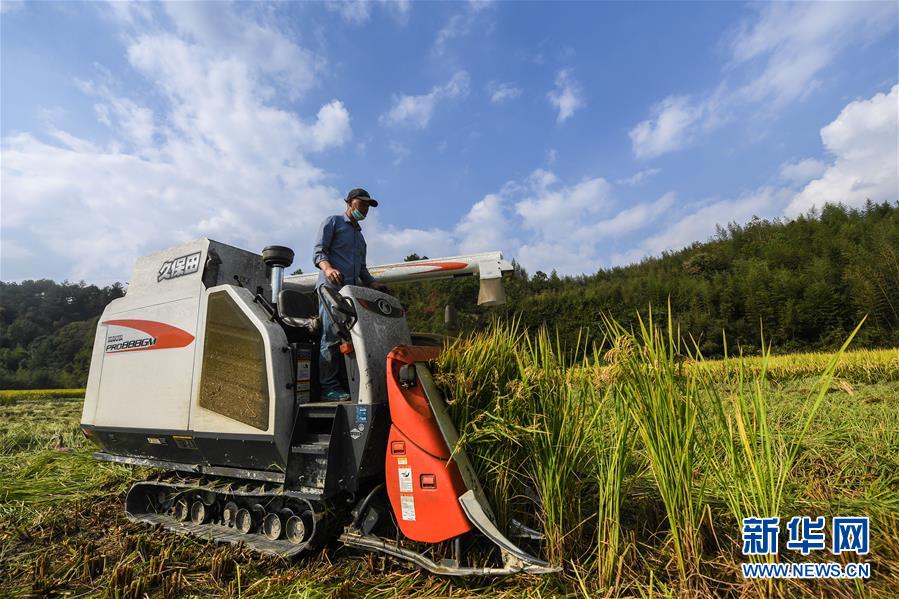 10月17日,工作人員操作收割機(jī)收割水稻。 新華社記者 徐昱 攝