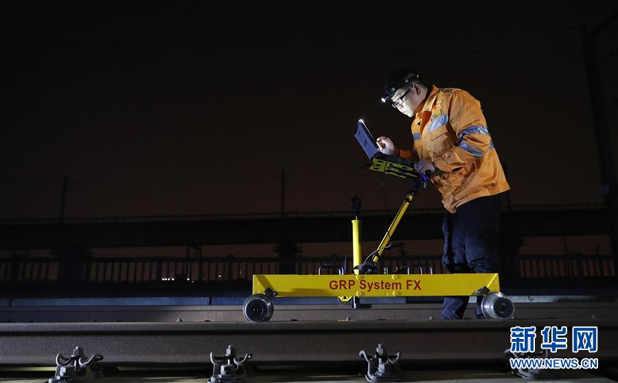 10月18日,劉訓(xùn)飛在滬寧城際上海安亭北線路所42#道岔上使用軌檢小車檢測線路。 新華社記者 方喆 攝