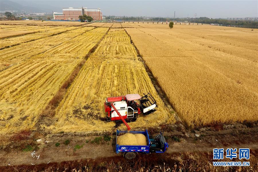 在太原市晉源區(qū)赤橋村,收割機(jī)在稻田里作業(yè)(10月17日無(wú)人機(jī)拍攝)。近日,山西省太原市晉源區(qū)2000多畝水稻迎來(lái)收割季。 金秋時(shí)節(jié),農(nóng)民們忙著收獲成熟的農(nóng)作物,喜迎豐收。 新華社記者 詹彥 攝