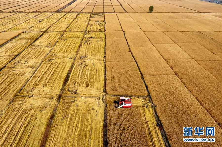 在太原市晉源區(qū)赤橋村,收割機(jī)在稻田里作業(yè)(10月17日無人機(jī)拍攝)。近日,山西省太原市晉源區(qū)2000多畝水稻迎來收割季。 金秋時(shí)節(jié),農(nóng)民們忙著收獲成熟的農(nóng)作物,喜迎豐收。 新華社記者 詹彥 攝