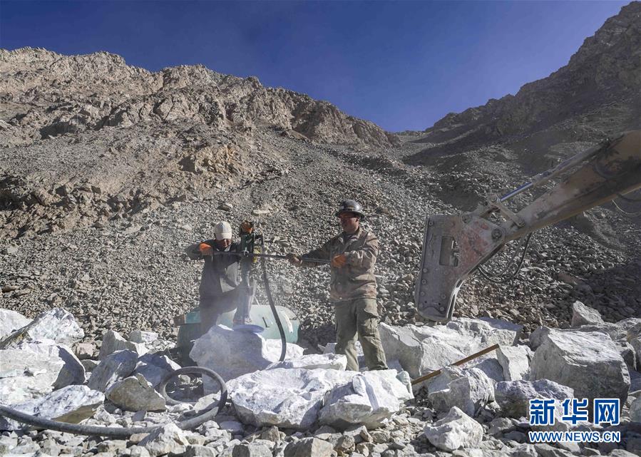 在興發(fā)達(dá)玉礦,采玉師傅們正往玉石上打眼,便于觀察玉石品質(zhì)(10月23日攝)。 新華社記者趙戈攝