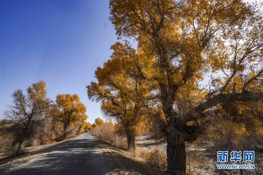 新疆輪臺縣胡楊林深處的一條小路(10月25日攝)。 10月中下旬,靜靜的塔里木河中下游一片金黃。胡楊深處,條條小路蜿蜒綿長通向遠方,引人入勝。 塔里木河是中國最長的內(nèi)陸河,這一區(qū)域原始胡楊林分布較為集中。隨著塔里木河連續(xù)19次向下游生態(tài)輸水,為胡楊林“解渴”,塔河兩岸生態(tài)得到明顯改善,沙地面積逐年減少。 新華社記者趙戈攝