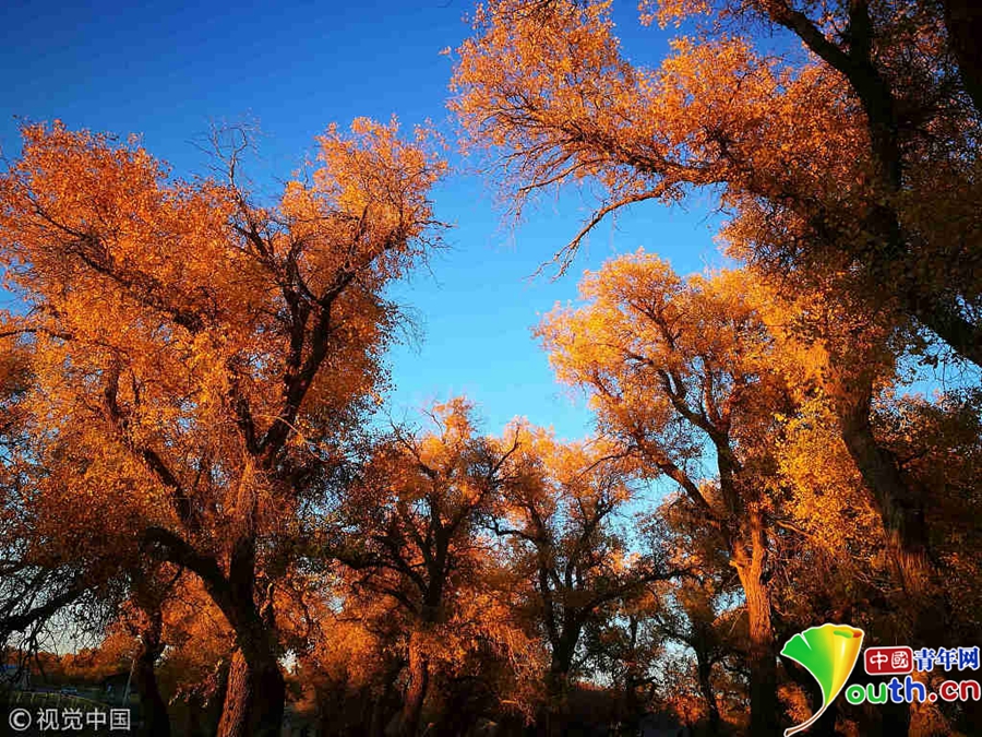 大片的胡楊樹葉由綠變黃,一眼望去,陽光下金色的樹葉襯著湛藍(lán)的天空于風(fēng)中婆娑起舞。