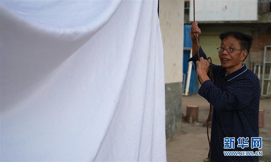 10月30日,曾紀(jì)連在寬田鄉(xiāng)山下村布置電影放映需要的幕布。 新華社記者 胡晨歡攝