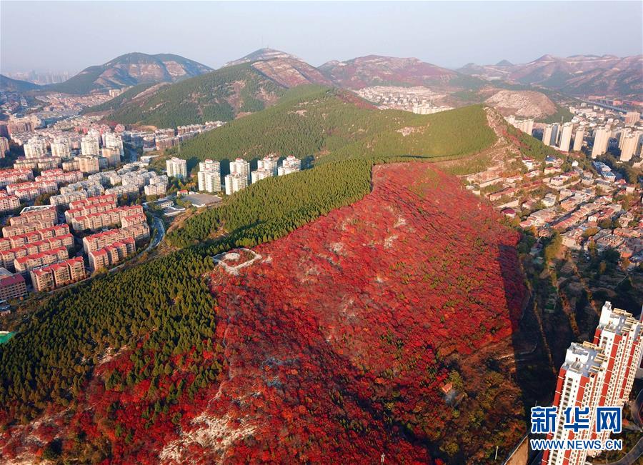 這是“一山雙色”的山東濟南楔子山(10月31日無人機拍攝)。 新華社記者朱崢攝