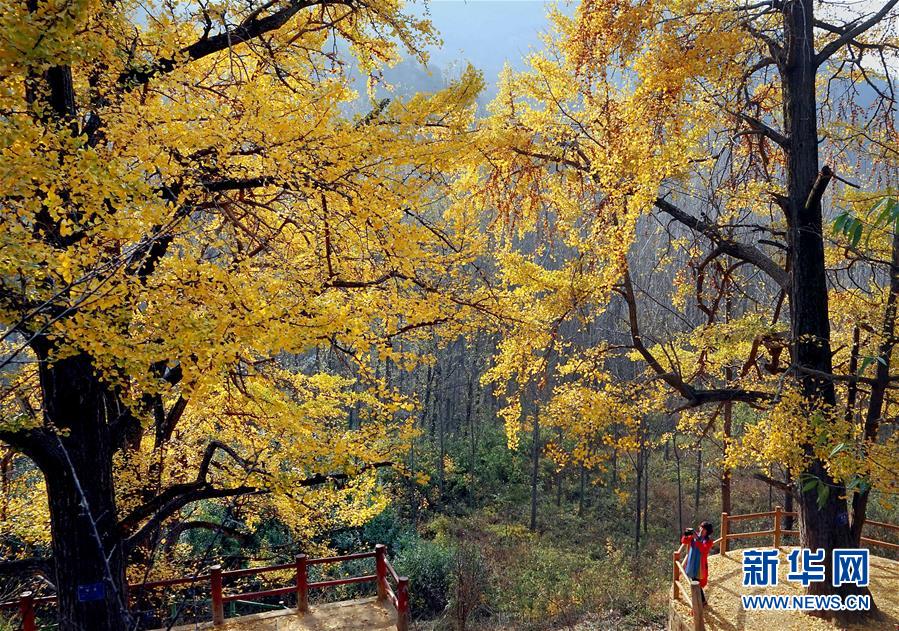 11月1日,游客在河南省嵩縣白河鄉(xiāng)下寺村古銀杏樹下拍照賞景。 深秋時節(jié),河南省嵩縣白河鄉(xiāng)下寺村的古銀杏林為小山村披上了“金甲”。漫天黃葉,遍地金色,一幢幢民居掩映在色彩斑斕的世界里,美不勝收,吸引了眾多游客賞景拍照。 新華社記者 李安 攝
