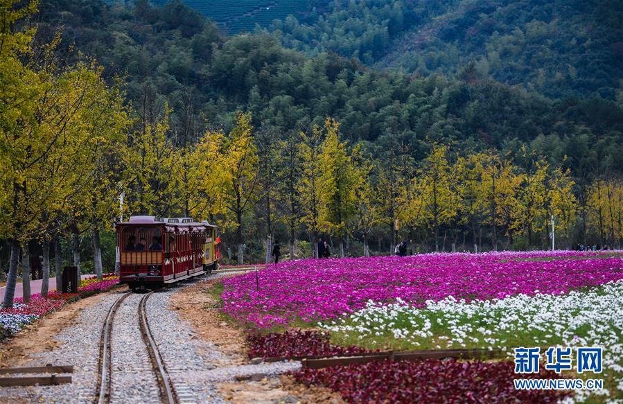 11月2日,游客乘坐觀光小火車觀賞“五彩花海”(無人機(jī)拍攝)。