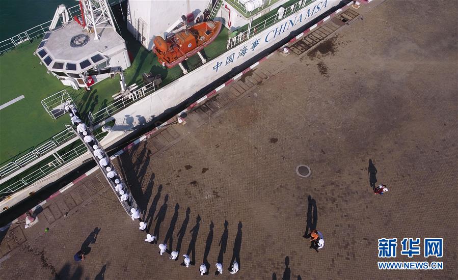 11月3日,海事執(zhí)法人員登上“海巡21”輪(無人機拍攝)。當(dāng)日,隨著“海巡21”輪緩緩駛離??诤J卤O(jiān)管基地碼頭,由瓊桂粵海事部門共同開展的瓊州海峽、北部灣及環(huán)海南島水域跨轄區(qū)聯(lián)合巡航執(zhí)法活動揭開序幕。新華社記者楊冠宇攝