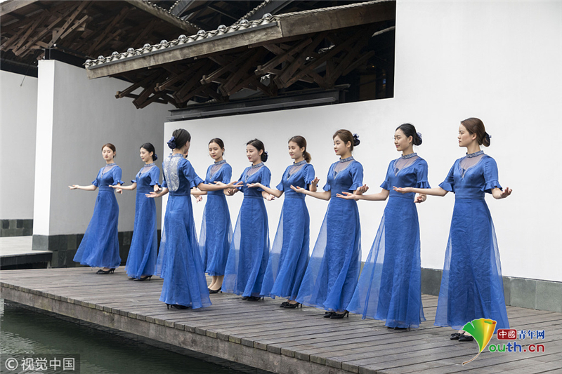 2014年11月17日,世界互聯(lián)網(wǎng)大會直播演練在浙江烏鎮(zhèn)舉行。來自浙江傳媒學院的大學生們,身著一襲青花瓷紋旗袍亮相,顯得分外嫵媚,引人注目。