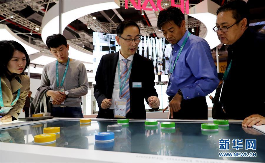 11月5日,一名德國(guó)西門子展臺(tái)的工作人員(中)向參觀者講解分布式能源系統(tǒng)的工作原理。 新華社記者 方喆 攝