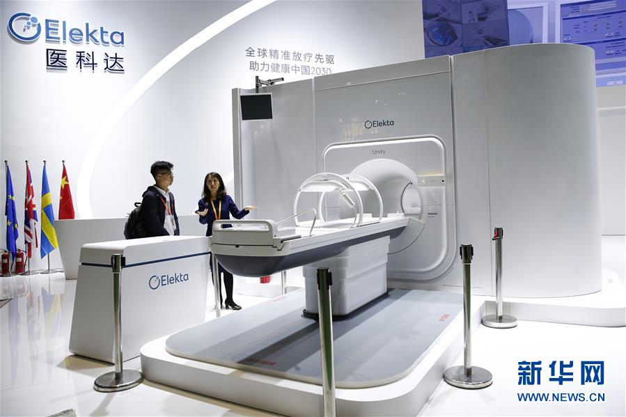 11月6日,瑞典醫(yī)科達(dá)公司工作人員為一名記者介紹高場強(qiáng)磁共振放療系統(tǒng)Elekta Unity。該款診斷級(jí)磁共振成像系統(tǒng)與先進(jìn)的放療加速器有機(jī)結(jié)合,可以在腫瘤放療治療的過程中實(shí)時(shí)、高分辨率地顯示和追蹤腫瘤的變化。 新華社記者 張玉薇 攝