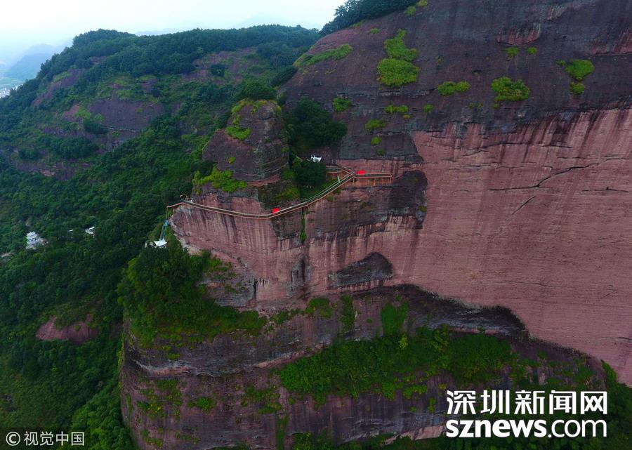 深圳新聞網(wǎng)訊 2018年6月19日,航拍江西贛州南武當(dāng)山百米高空玻璃棧道。棧道緊貼峭壁,在懸崖之上凌空蜿蜒穿行,猶如一條玉龍盤(pán)旋在綠林石海之中。 南武當(dāng)山位于江西最南端的龍南縣武當(dāng)鎮(zhèn)境內(nèi),景區(qū)核心面積達(dá)到13.5平方公里,擁有99座千姿百態(tài)的巍峨石峰,丹霞地質(zhì)風(fēng)貌突出,連綿十里,被稱(chēng)為“武當(dāng)十里畫(huà)廊”。