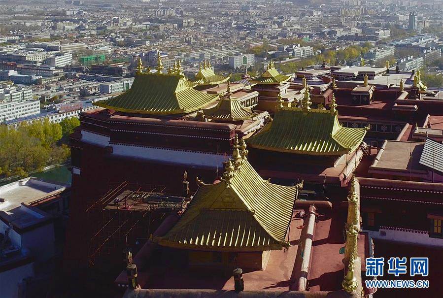 修繕后的布達(dá)拉宮金頂群(11月7日無(wú)人機(jī)拍攝)。新華社記者普布扎西 攝
