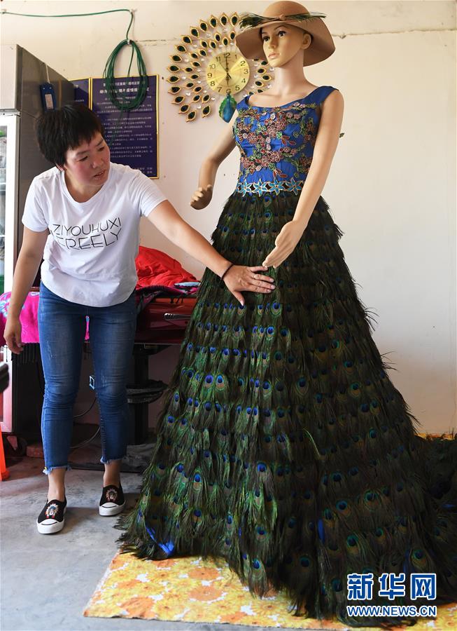 5月16日,在重慶市銅梁區(qū)永嘉鎮(zhèn)高龍村,張榮蘋在整理一件孔雀羽毛服裝。 新華社記者 王全超 攝