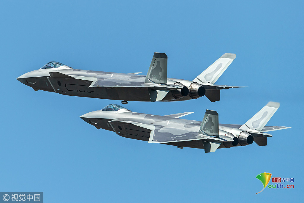 圖七:2018年11月6日,廣東珠海航展上,兩架殲-20戰(zhàn)機(jī)組成雙機(jī)編隊進(jìn)行飛行表演。
