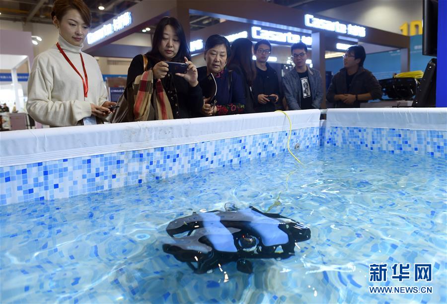 11月10日,人們在展會現場觀看展出的一款小型水下機器人。 新華社記者韓傳號攝