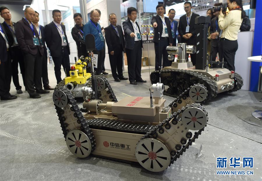 11月10日,與會(huì)嘉賓在觀看展出的消防機(jī)器人。 新華社記者韓傳號(hào)攝