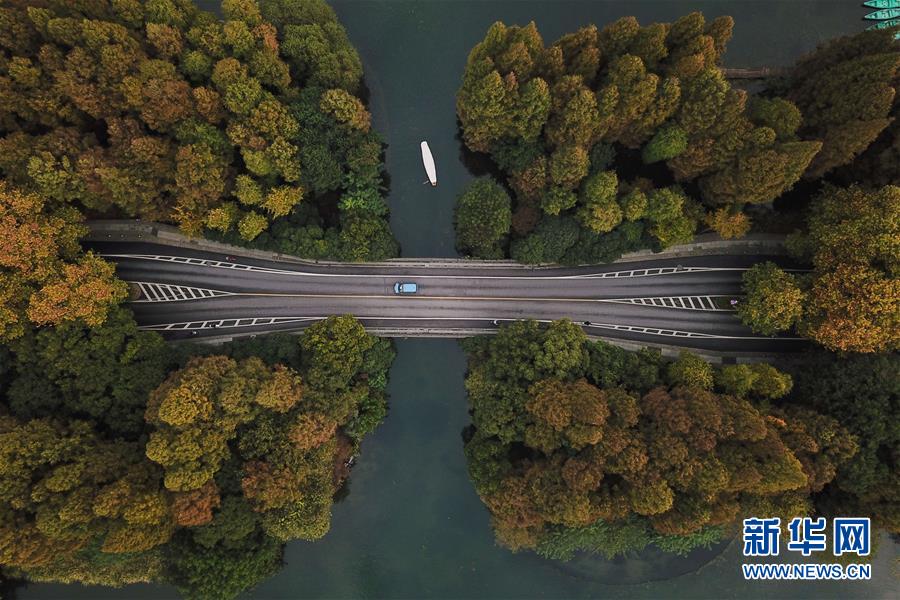 11月13日,一艘游船在杭州西湖上行駛(無人機(jī)拍攝)。 時(shí)值初冬,杭州市西湖景區(qū)層林盡染,色彩斑斕,別有一番韻味。