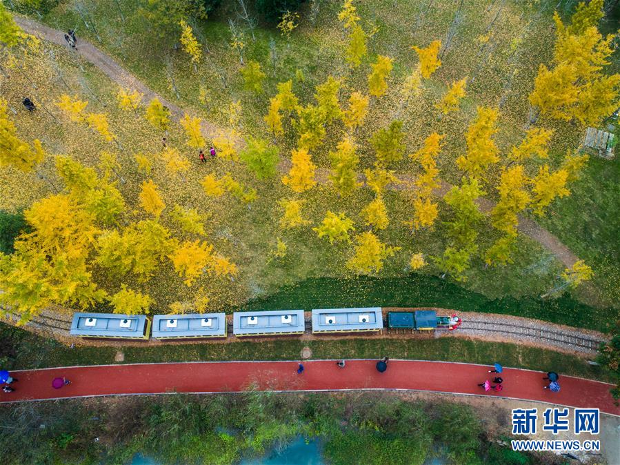 一列觀光小火車帶著游客穿行在銀杏林里(11月16日無(wú)人機(jī)拍攝)。近日,在浙江省長(zhǎng)興縣小浦鎮(zhèn),“十里銀杏長(zhǎng)廊”和近千畝花海經(jīng)過近一年的升級(jí)改造后,以嶄新的面貌與游客見面?;ê?、觀光小火車、古村民宿、銀杏長(zhǎng)廊等旅游項(xiàng)目全面提升了小浦鎮(zhèn)鄉(xiāng)村旅游的品質(zhì)。新華社記者 徐昱 攝