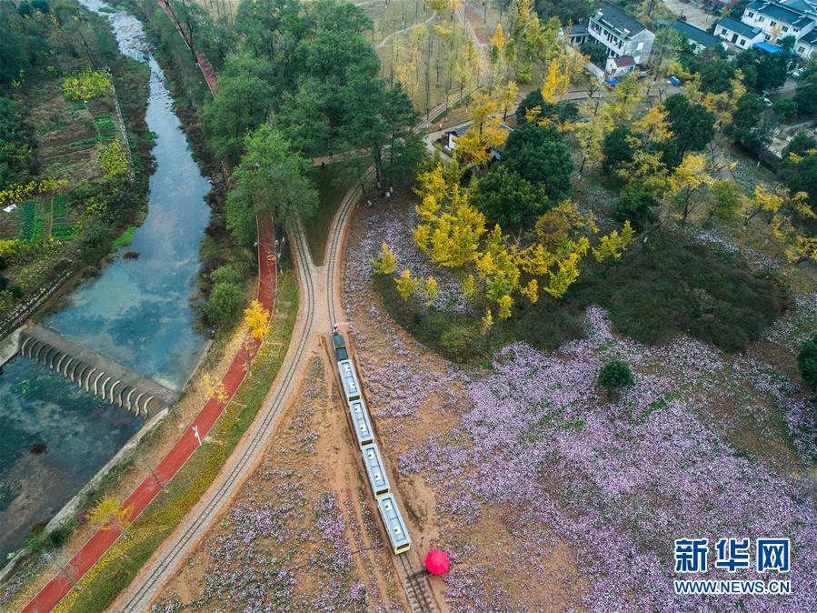 一列觀光小火車帶著游客穿行在銀杏林和花海之間(11月16日無(wú)人機(jī)拍攝)。近日,在浙江省長(zhǎng)興縣小浦鎮(zhèn),“十里銀杏長(zhǎng)廊”和近千畝花海經(jīng)過近一年的升級(jí)改造后,以嶄新的面貌與游客見面?;ê?、觀光小火車、古村民宿、銀杏長(zhǎng)廊等旅游項(xiàng)目全面提升了小浦鎮(zhèn)鄉(xiāng)村旅游的品質(zhì)。新華社記者 徐昱 攝