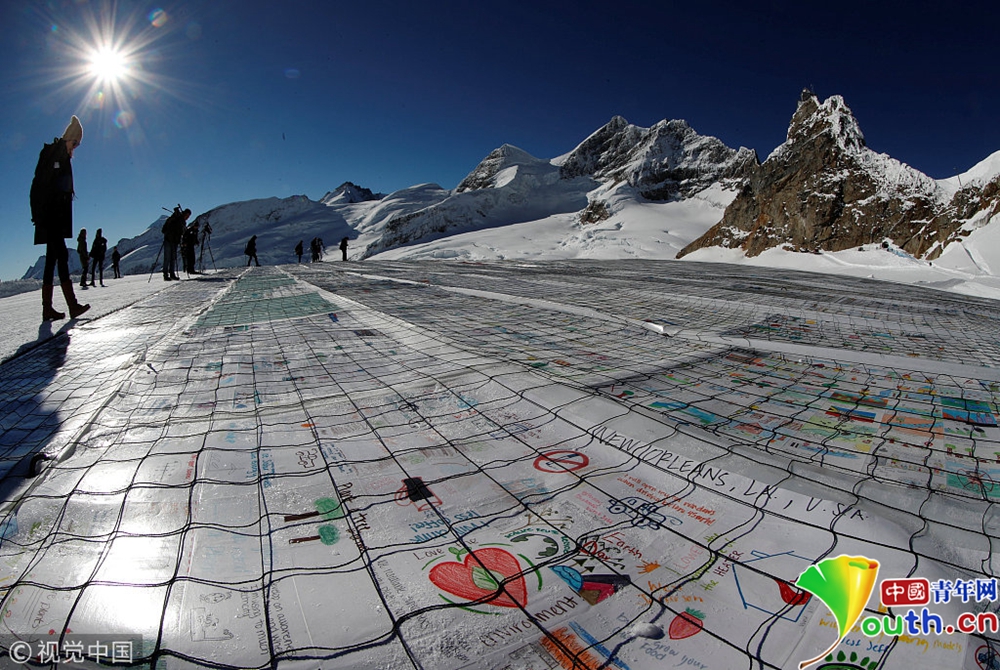 當?shù)貢r間11月16日,瑞士阿爾卑斯山“少女峰”上展示的十萬多張明信片,呼吁關(guān)注氣候變暖。這些明信片是由世界各地的人們寄來的,打破了世界上最大明信片的吉尼斯世界記錄。