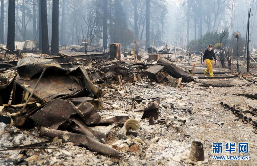 11月13日,在美國(guó)加利福尼亞州天堂鎮(zhèn),搜救人員在山火過后的廢墟工作。