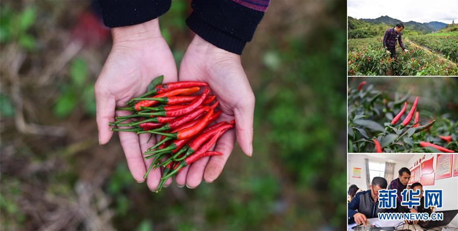 拼版照片:左圖為在大浪鎮(zhèn)大德村,龍德手捧剛剛收獲的辣椒;右上圖為龍德在摘辣椒;右中圖為合作社種植的辣椒;右下圖為龍德(中)在辦公室里工作(照片均攝于11月18日)。龍德是大德村的致富帶頭人,目前合作社種植有400多畝辣椒,帶動(dòng)106戶貧困戶參與。 廣西融水苗族自治縣是國家扶貧工作重點(diǎn)縣,全縣“九山半水半分田”,生活生產(chǎn)環(huán)境較為惡劣,脫貧攻堅(jiān)任務(wù)艱巨,目前還有7.68萬貧困人口。面對經(jīng)濟(jì)發(fā)展落后、貧困面廣且程度深的現(xiàn)狀,當(dāng)?shù)匕衙撠毠?jiān)與創(chuàng)新產(chǎn)業(yè)扶持相結(jié)合,依托生態(tài)資源優(yōu)勢,實(shí)施“特色產(chǎn)業(yè)富民行動(dòng)”,通過發(fā)展特色民族旅游、林下經(jīng)濟(jì)和特色養(yǎng)殖業(yè)等扶貧產(chǎn)業(yè),帶動(dòng)貧困群眾依靠勤勞的雙手,拔窮根摘窮帽,實(shí)現(xiàn)脫貧致富。據(jù)了解,目前全縣貧困戶參與特色產(chǎn)業(yè)發(fā)展的有2.9萬戶,扶貧產(chǎn)業(yè)覆蓋率達(dá)95%。 新華社記者 黃孝邦 攝