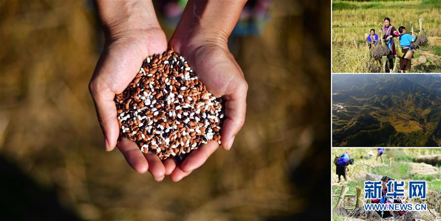 拼版照片:左圖為在安太鄉(xiāng)元寶村,合作社負(fù)責(zé)人謝秀萍手捧今年收獲的三色香糯;右上圖為合作社負(fù)責(zé)人謝秀萍(中)和社員們在收香糯;右中圖為位于苗山深處的香糯種植基地;右下圖為謝秀萍在收香糯(照片均攝于10月30日)。謝秀萍是當(dāng)?shù)叵闩捶N植合作社負(fù)責(zé)人,帶動(dòng)幾百戶貧困戶種植香糯。香糯是廣西融水大苗山的特產(chǎn),它生長在高寒高海拔的特殊自然環(huán)境中,產(chǎn)量少,營養(yǎng)價(jià)值高。 廣西融水苗族自治縣是國家扶貧工作重點(diǎn)縣,全縣“九山半水半分田”,生活生產(chǎn)環(huán)境較為惡劣,脫貧攻堅(jiān)任務(wù)艱巨,目前還有7.68萬貧困人口。面對經(jīng)濟(jì)發(fā)展落后、貧困面廣且程度深的現(xiàn)狀,當(dāng)?shù)匕衙撠毠?jiān)與創(chuàng)新產(chǎn)業(yè)扶持相結(jié)合,依托生態(tài)資源優(yōu)勢,實(shí)施“特色產(chǎn)業(yè)富民行動(dòng)”,通過發(fā)展特色民族旅游、林下經(jīng)濟(jì)和特色養(yǎng)殖業(yè)等扶貧產(chǎn)業(yè),帶動(dòng)貧困群眾依靠勤勞的雙手,拔窮根摘窮帽,實(shí)現(xiàn)脫貧致富。據(jù)了解,目前全縣貧困戶參與特色產(chǎn)業(yè)發(fā)展的有2.9萬戶,扶貧產(chǎn)業(yè)覆蓋率達(dá)95%。 新華社記者 黃孝邦 攝