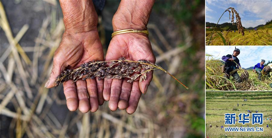 拼版照片:左圖為在安太鄉(xiāng)元寶村,80歲的賈榮專手捧剛剛收獲的香糯;右上圖為成熟待收的香糯;右中圖為賈榮專(左)在收割香糯;右下圖為村民們在收香糯(照片均攝于10月30日)。2017年,賈榮專加入村里的香糯種植合作社。香糯是廣西融水大苗山的特產(chǎn),它生長在高寒高海拔的特殊自然環(huán)境中,產(chǎn)量少,營養(yǎng)價值高。 廣西融水苗族自治縣是國家扶貧工作重點(diǎn)縣,全縣“九山半水半分田”,生活生產(chǎn)環(huán)境較為惡劣,脫貧攻堅(jiān)任務(wù)艱巨,目前還有7.68萬貧困人口。面對經(jīng)濟(jì)發(fā)展落后、貧困面廣且程度深的現(xiàn)狀,當(dāng)?shù)匕衙撠毠?jiān)與創(chuàng)新產(chǎn)業(yè)扶持相結(jié)合,依托生態(tài)資源優(yōu)勢,實(shí)施“特色產(chǎn)業(yè)富民行動”,通過發(fā)展特色民族旅游、林下經(jīng)濟(jì)和特色養(yǎng)殖業(yè)等扶貧產(chǎn)業(yè),帶動貧困群眾依靠勤勞的雙手,拔窮根摘窮帽,實(shí)現(xiàn)脫貧致富。據(jù)了解,目前全縣貧困戶參與特色產(chǎn)業(yè)發(fā)展的有2.9萬戶,扶貧產(chǎn)業(yè)覆蓋率達(dá)95%。 新華社記者 黃孝邦 攝