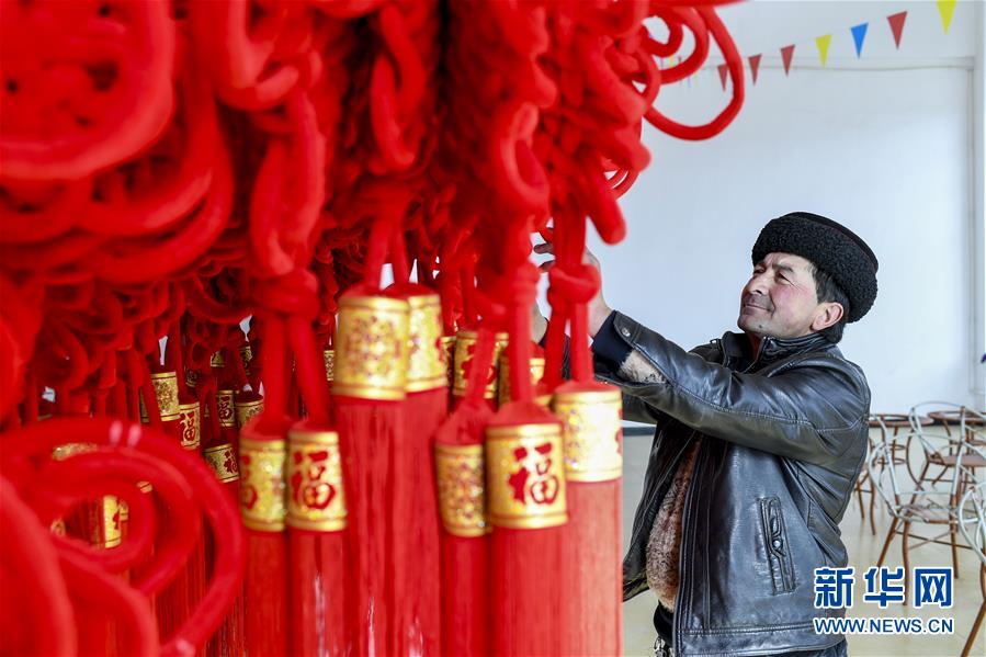 在塔什庫爾干塔吉克自治縣塔提庫力易地扶貧搬遷安置點的衛(wèi)星工廠,都熱·加爾曼在參觀由村民編制的手工藝品(11月18日攝)。新華社記者胡虎虎攝