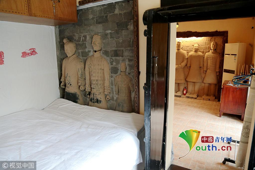 2018年11月27日,西安,民宿臥室內(nèi)的“兵馬俑”裝飾。近日,西安一家主打“兵馬俑”元素的民宿走紅,“兵馬俑”元素遍布在房間各個角落,“深情注視”著在此休憩的旅客,加上昏黃的燈光及復(fù)古的裝飾,讓不少旅客感嘆如同居住在“秦始皇陵”。 張遠(yuǎn)(陜西分社)/視覺中國