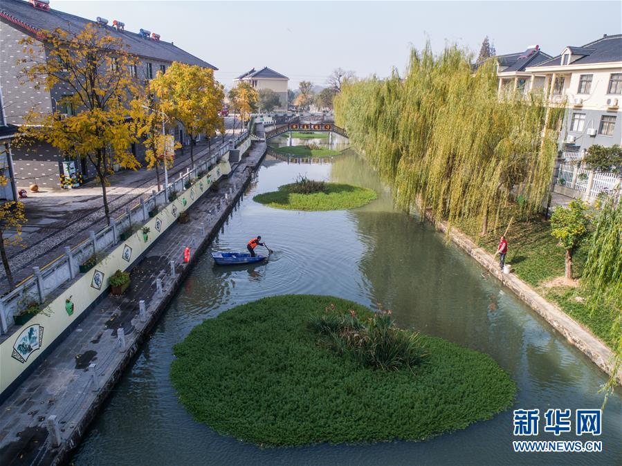 11月28日,長(zhǎng)興縣虹星橋鎮(zhèn)港口村東港內(nèi),工作人員在打撈水面漂浮物(無(wú)人機(jī)拍攝)。東港全長(zhǎng)1500米,環(huán)繞港口新村。2012年,新村建成后,港口村通過(guò)加固河岸、清理河道、種植浮草等方式對(duì)東港進(jìn)行生態(tài)治理,并由該村黨總支書記孫根法擔(dān)任河長(zhǎng),定期開展巡查,引導(dǎo)村民自覺維護(hù)河道整潔。 新華社記者 徐昱 攝