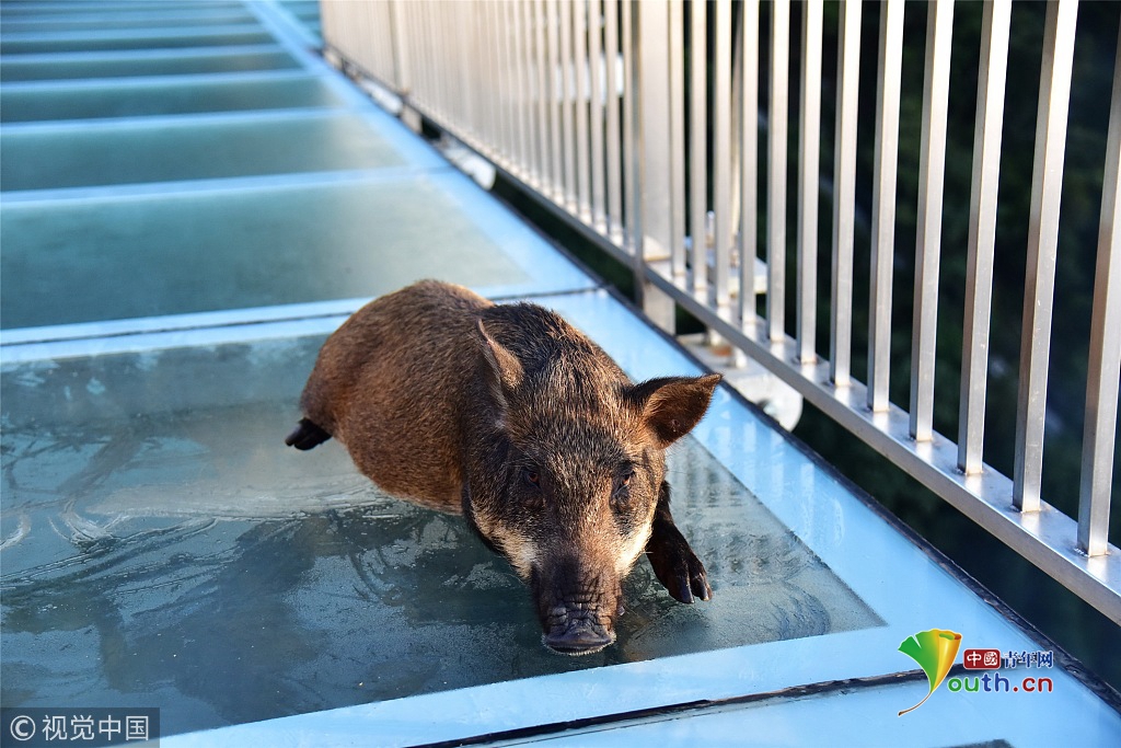 2018年11月29日早上7時(shí)多,古龍峽玻璃大峽谷出現(xiàn)了云海奇觀,云蒸霧繞,如同仙境。正在玻璃橋上值早班的保安發(fā)現(xiàn),玻璃橋上闖入一只動(dòng)物,體型還比較大,由于霧氣大,不太清楚是什么動(dòng)物。保安走前一看,竟然發(fā)現(xiàn)是1只山豬。