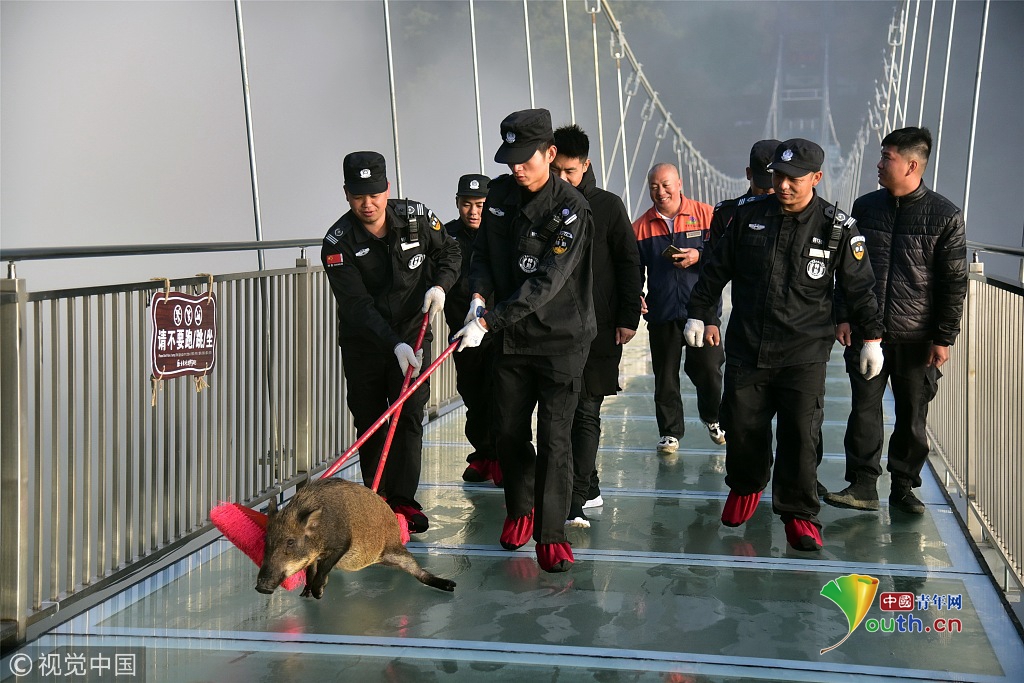 2018年11月29日,一只山豬誤入廣東清遠古龍峽云天玻霸玻璃橋,結果被嚇得趴在橋面上發(fā)抖,幾名值班保安齊心協(xié)力將山豬從玻璃橋上解救出來,將其送回森林。