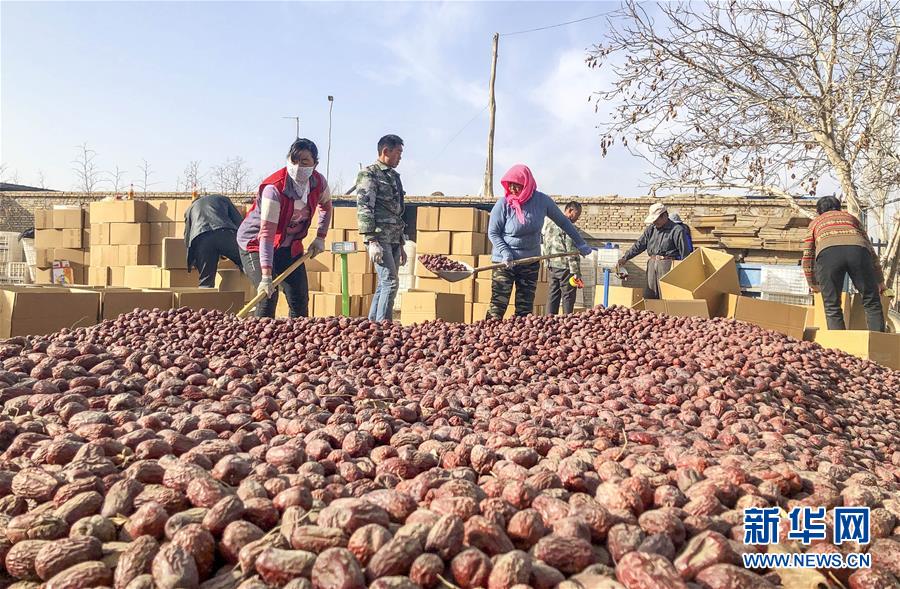拜什托格拉克鄉(xiāng)伊斯勒克墩村村民將晾曬好的紅棗裝箱(11月29日攝)。 新華社記者 關(guān)俏俏 攝