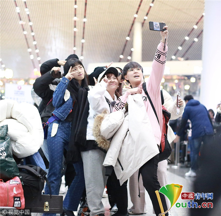 2018年12月3日,北京,“火箭少女101”全體成員現(xiàn)身機(jī)場(chǎng)前往國(guó)外錄制團(tuán)總綜。其中孟美岐戴著墨鏡,一身全黑運(yùn)動(dòng)裝扮,大步流星氣場(chǎng)超強(qiáng),楊蕓晴、yamy、楊超越等成員緊隨其后,大家還一起在機(jī)場(chǎng)玩起自拍,好不歡樂(lè)。