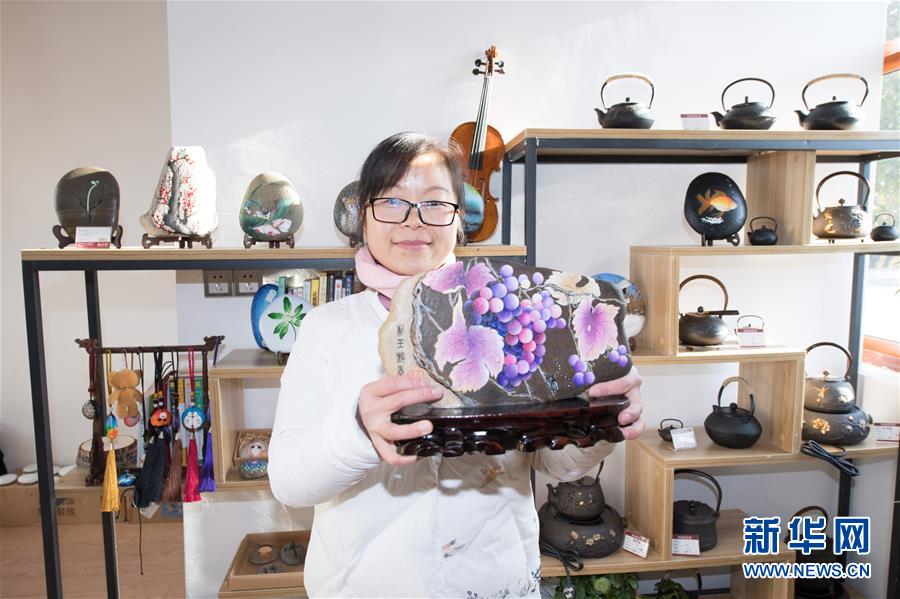 “農(nóng)民畫家”陳蘇蘭在開設(shè)的工作室內(nèi)展示創(chuàng)作的石頭畫《下姜葡萄》(1月10日攝)。