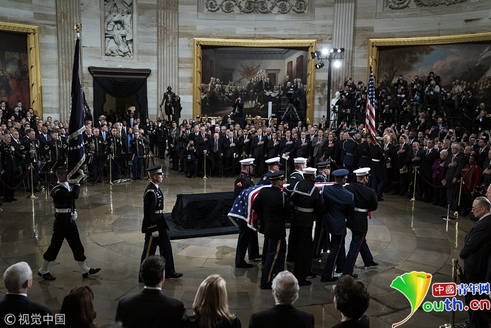 靈柩由一支軍事儀仗隊(duì)抬入圓形大廳,安置在1865年為林肯總統(tǒng)的棺材所建造的靈柩臺(tái)上。