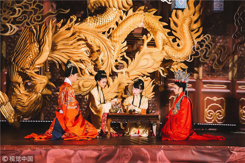 2018年11月18日,浙江嘉興。海寧一位女孩為了籌辦自己的漢婚大禮,囤衣服、囤首飾,準(zhǔn)備整整六年。圖為婚禮現(xiàn)場。周建仕/視覺中國
