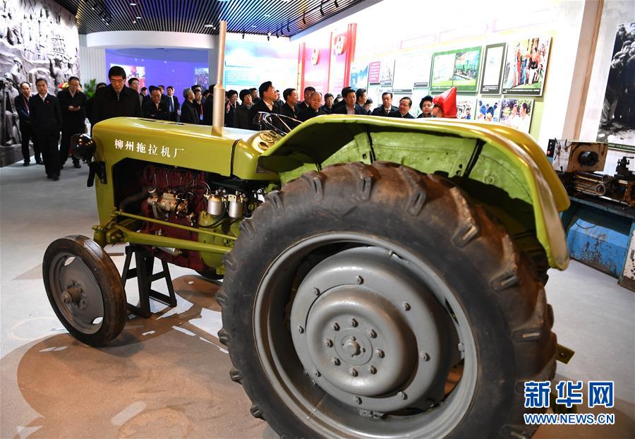 12月10日,觀眾在參觀廣西柳州20世紀(jì)60年代試制成功并生產(chǎn)的拖拉機(jī)。 當(dāng)日,廣西壯族自治區(qū)成立60周年大型成就展在位于南寧的廣西規(guī)劃館開幕。 新華社記者 周華 攝